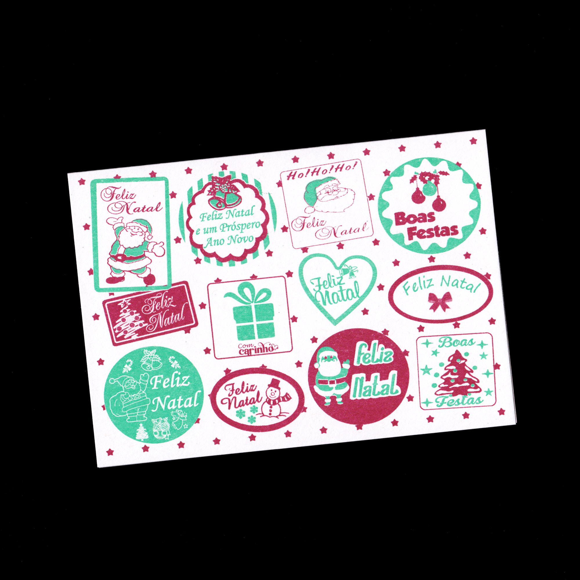 A6 Risograph Christmas card, printed in the UK in cranberry and seafoam soy-based inks